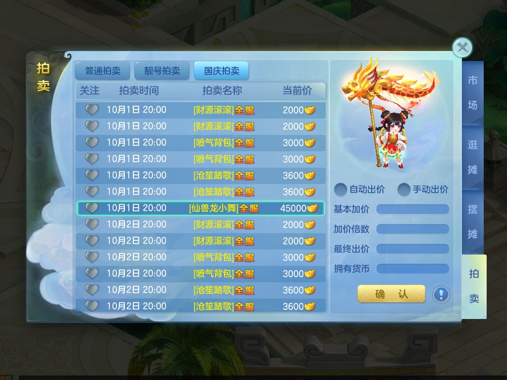10月1日、2日晚上20:00,将开启全服拍卖活动!感兴趣的少侠记得前往参加哦~