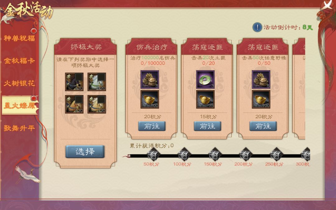 需要主公们先选择本次活动中可获得的终极大奖,终极大奖一旦确认就不可更改了哟~在活动期间,系统会在每天凌晨刷新任务,每日完成活跃任务获得积分,当积分达到指定值,即可领取积分宝箱奖励!领取一定数量的积分宝箱奖励后,就能领走终极大奖!