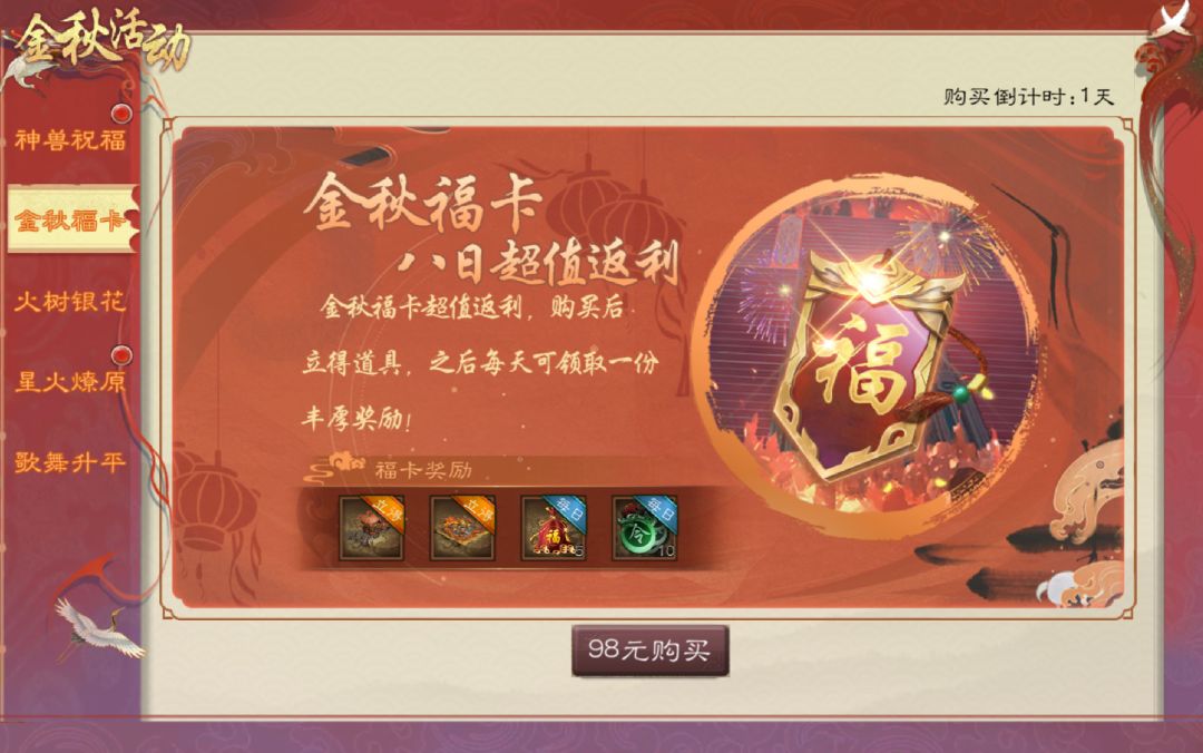 购买金秋福卡,领取八日超值返利!主公们在购买福卡后,可以获得金秋十月主城皮肤和行军皮肤,除此之外,之后的每天都还能领取一份丰厚的奖励~