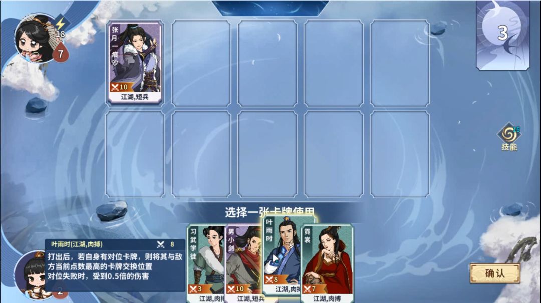 由于就剩两滴血,习武学徒的两个专属辅助还没出来,我选择第一个让老叶上,嗯,有点险,没有特殊情况的话,只要对面第一张牌的战斗力不高于11就行。