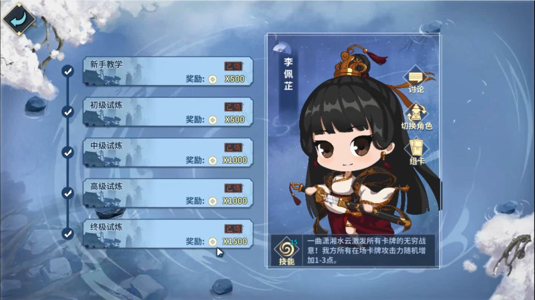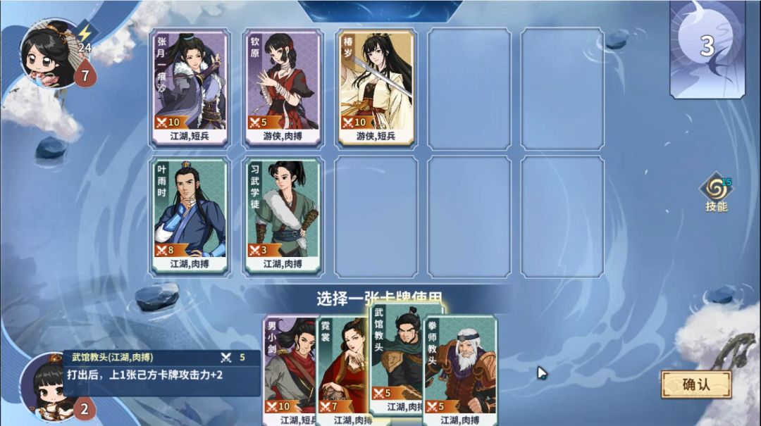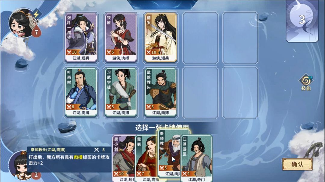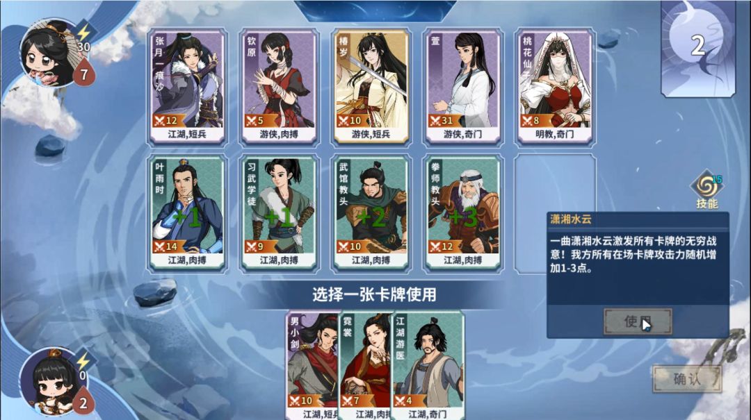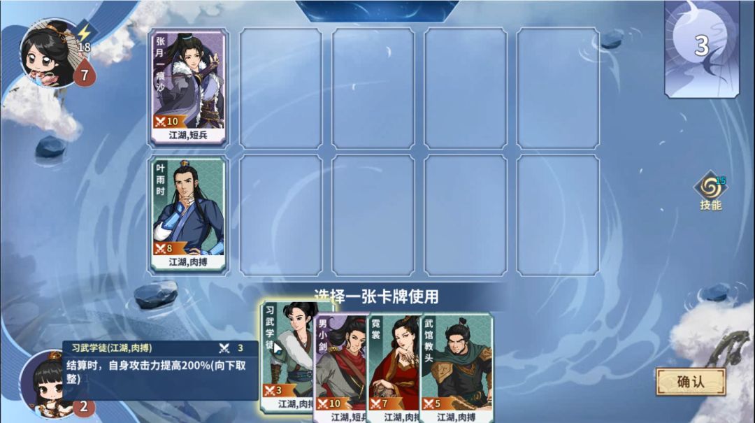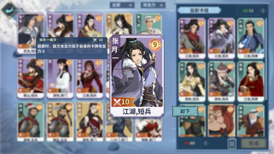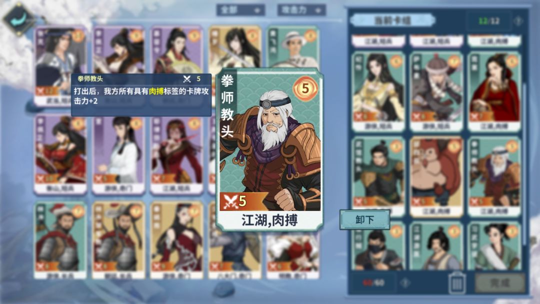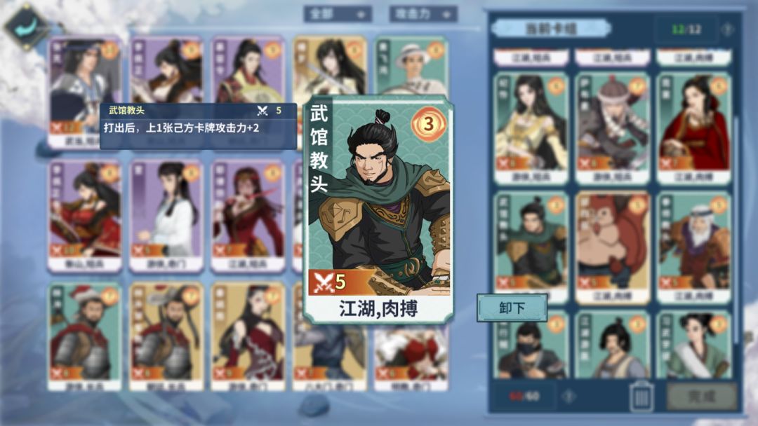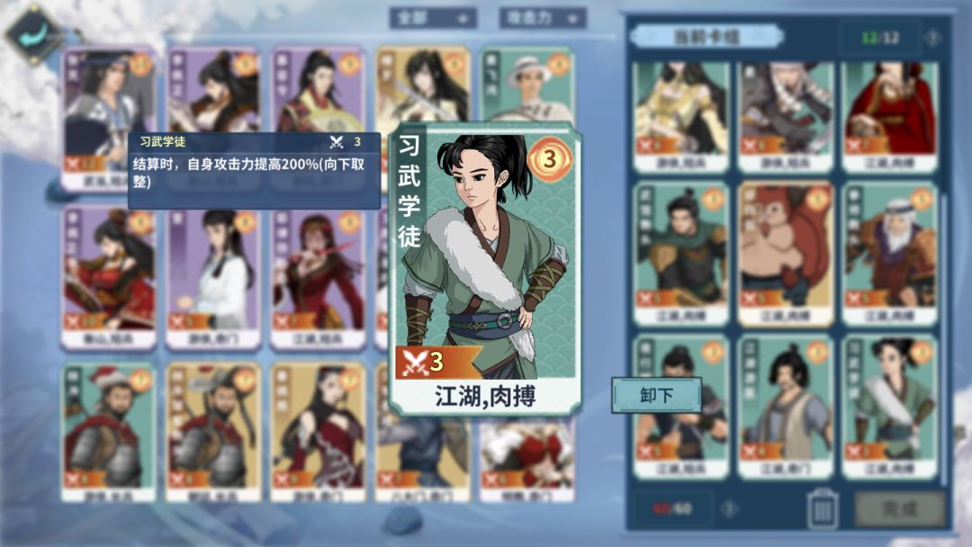 问题是:12张牌,我很难在第一轮牌局里就能凑出让习武学徒攻击力最大化的阵容,除非你用张少爷或者叶雨时选牌,但是个人感觉这样上限不高,我喜欢用李佩芷,这样到最后伤害爆炸。