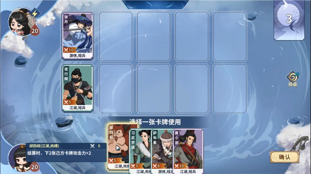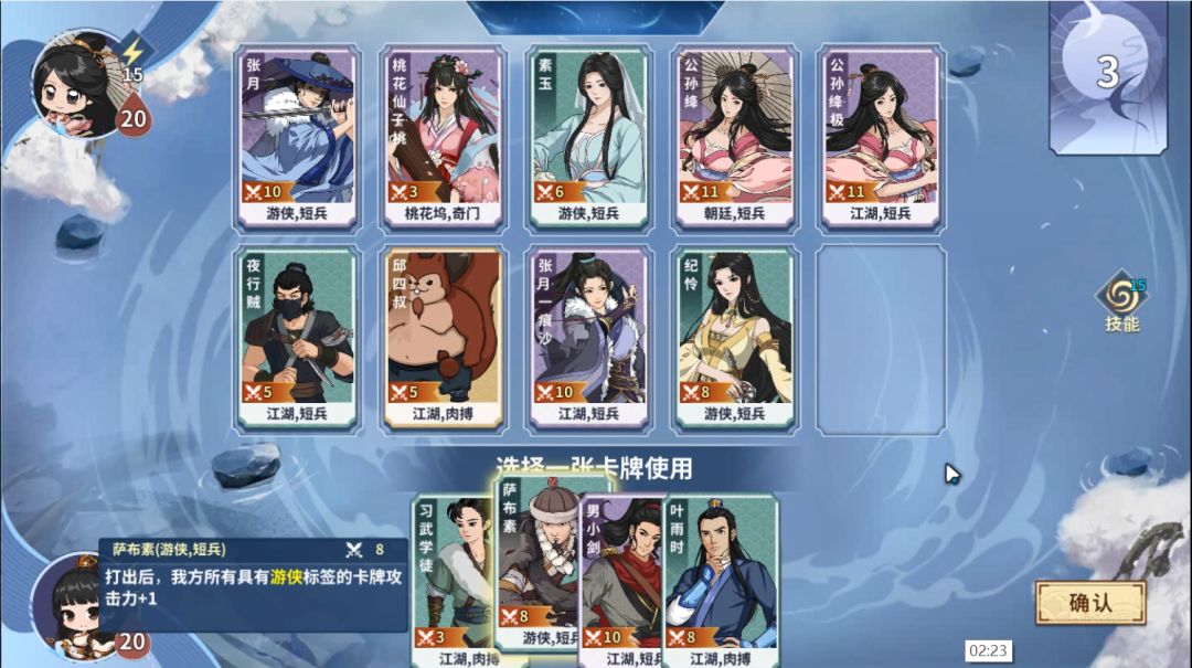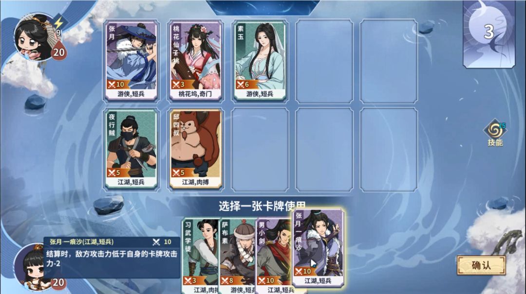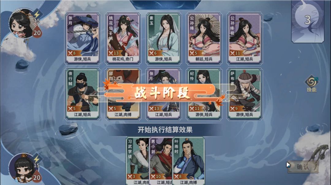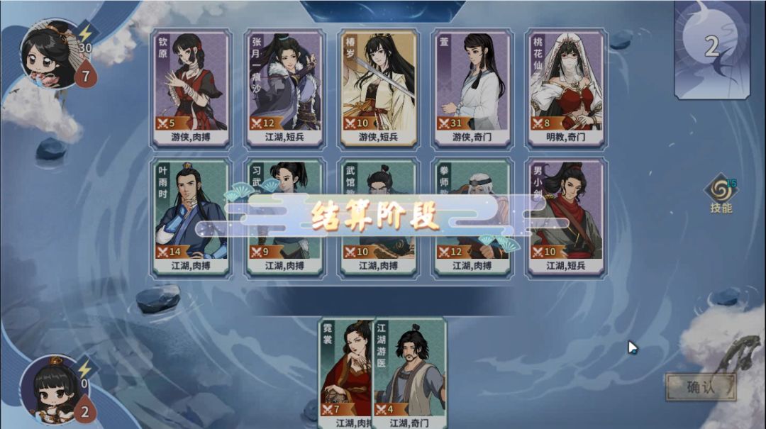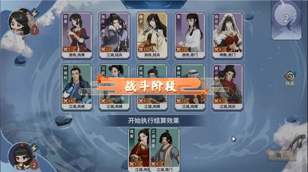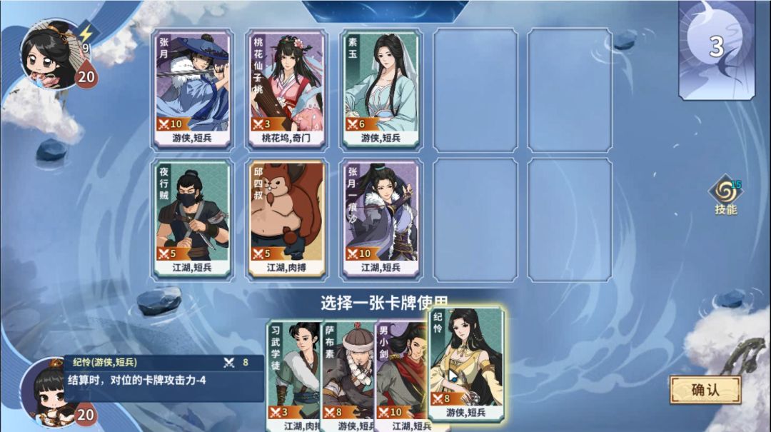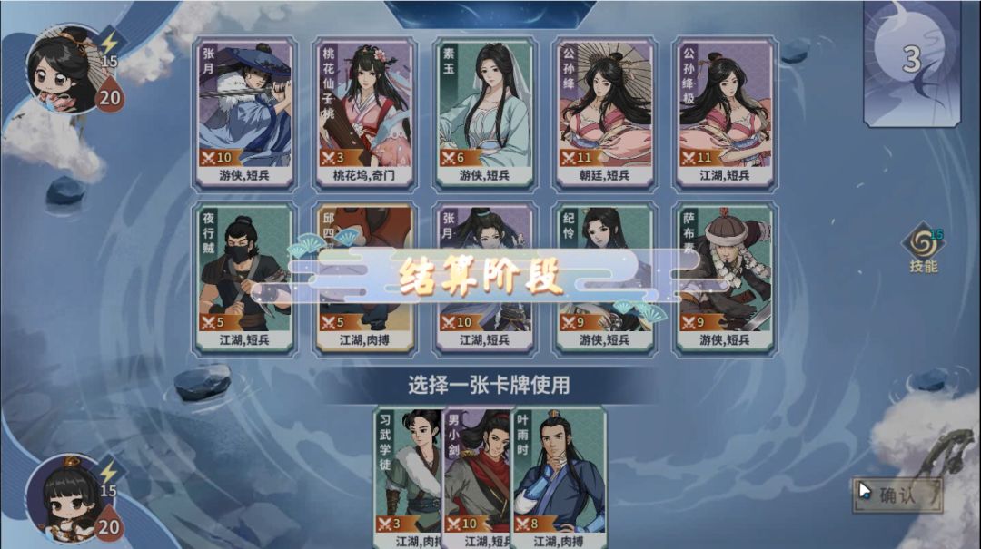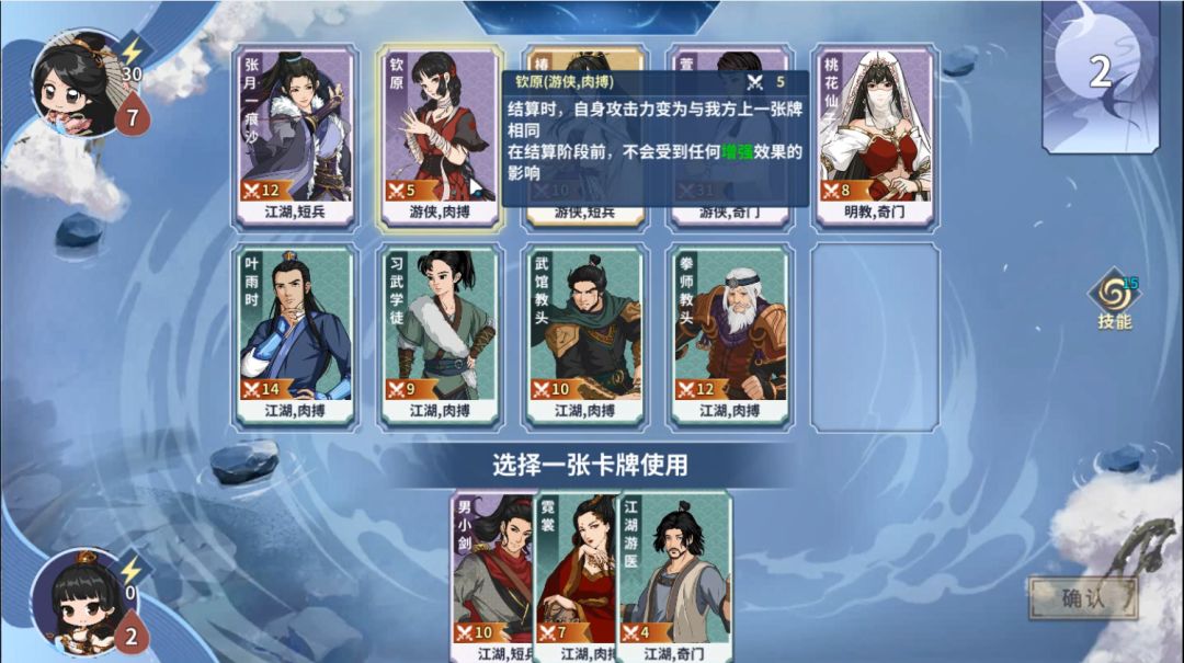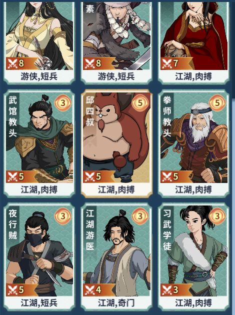 问题是:12张牌,我很难在第一轮牌局里就能凑出让习武学徒攻击力最大化的阵容,除非你用张少爷或者叶雨时选牌,但是个人感觉这样上限不高,我喜欢用李佩芷,这样到最后伤害爆炸。