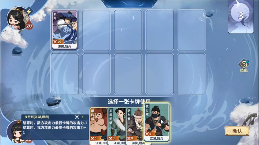 可以看到,牌组挺乱,前三张牌不适合第一张出,我选择让野行贼上去给对面加debuff。(炮灰牌)