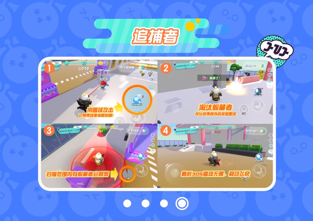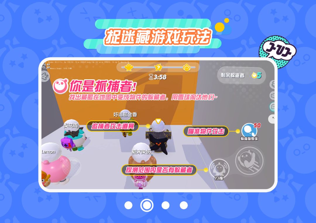 追捕者,则擅长发现环境中的一切违和,并配备了“高端科技”扫描器和雪球。扫描器可以探测一定范围内是否有躲藏者,若有则会发出红色警报;雪球击中躲藏者则能令其淘汰出局。雪球数量有限,在淘汰躲藏者后可以获得额外的奖励雪球,注意省着点用。而在最后30秒里,追捕者还将在压力下迸发出强大的力量,不仅移动飞快,更有无限雪球,向视线范围内所有可疑物件开砸吧!