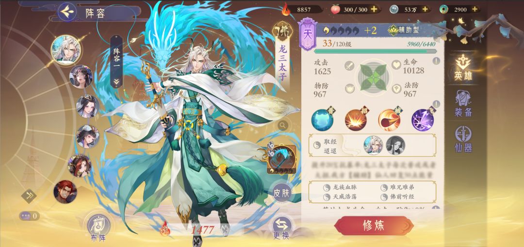 【取经迢迢】:和唐僧一起上阵,即可激活缘分效果:提升一定抗暴率;龙三太子每次普攻或者大招时,可给我方辅助仙人回复能量。