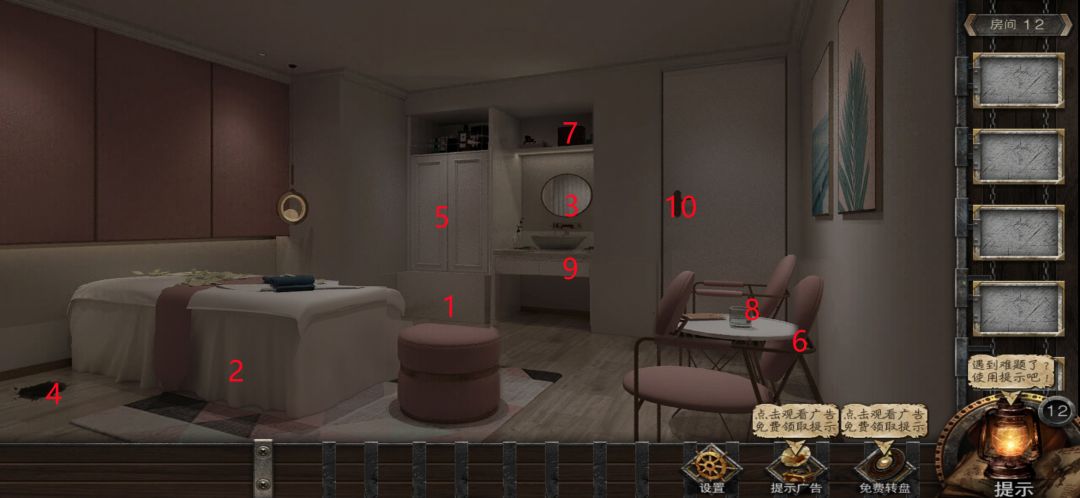 5、根据地面线索,调整柜门2边的机关打开柜门,拿到带锁的梯子6、移动椅子,露出椅子背后,拿到钳子