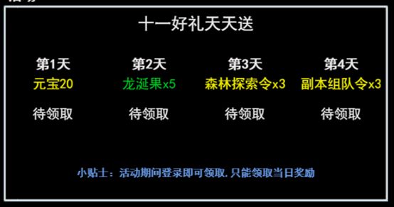 活动介绍:十一假期期间,通关组队副本,有概率掉落祝福“国”“庆”“快”“乐”等字,收集齐后可兑换元宝奖励。