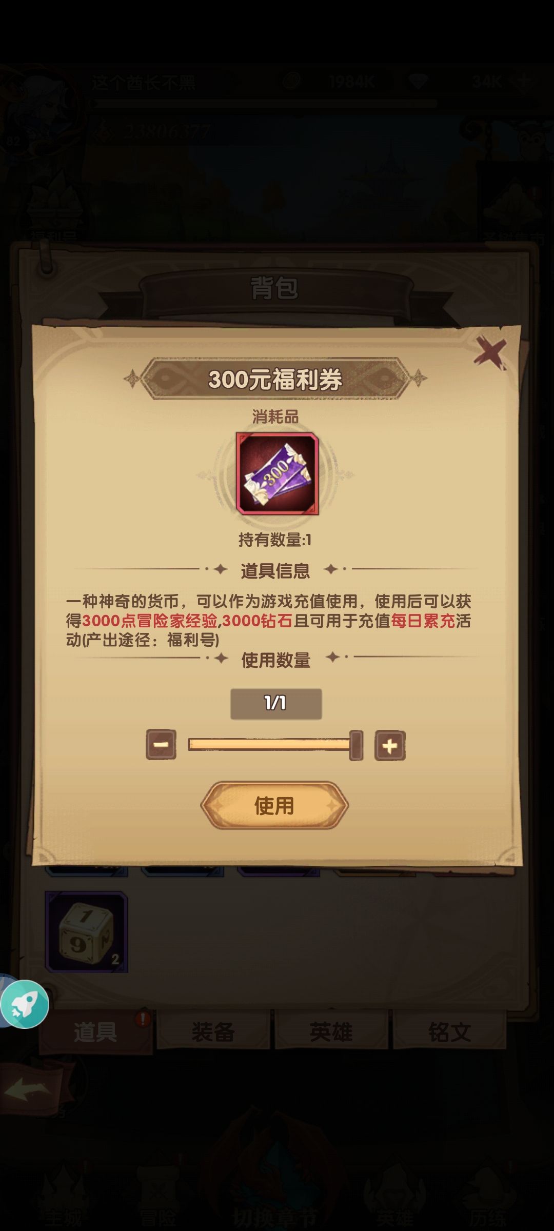 再说一下券的使用方法。券不能用来买礼包买钻石,只能直接把券打开,会给你相应的钻石跟冒险家经验。