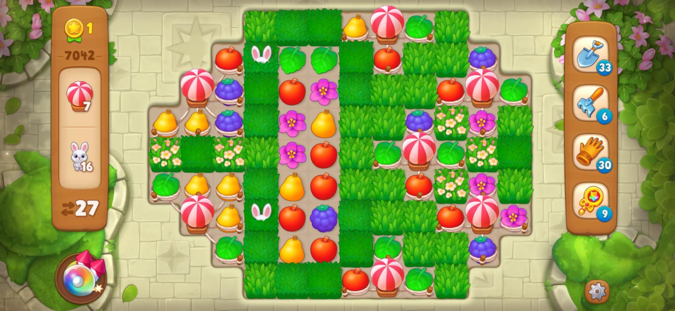 接下来我们的目标就很明确,尽可能多地消除野草,合成道具。我的建议是先消除左边的,因为左边的热气球和小兔子相对跟少一些,我们完全可以先将左边的目标搜集完成,并在这个过程中合成双彩,为减轻右边的游戏难度做一些准备。