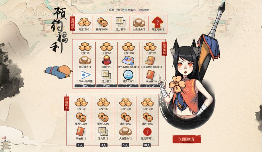 预约活动从即日起至公测前一天23:59结束,参与预约活动的玩家将在游戏公测后获得预约奖励,注意使用预约时的手机号注册,游戏奖励将发送到游戏邮箱内。江湖路远,各位御史大人,期待与你相见!