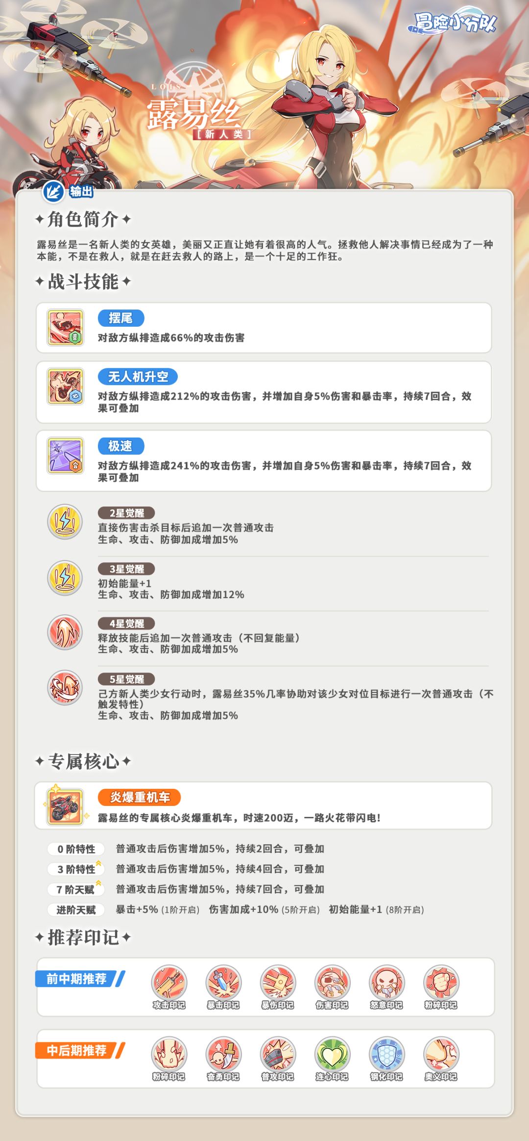 简介:露易丝是一名新人类的女英雄,美丽又正直让她有着很高的人气。拯救他人解决事情已经成为了一种本能,不是在救人,就是在赶去救人的路上,是一个十足的工作狂。