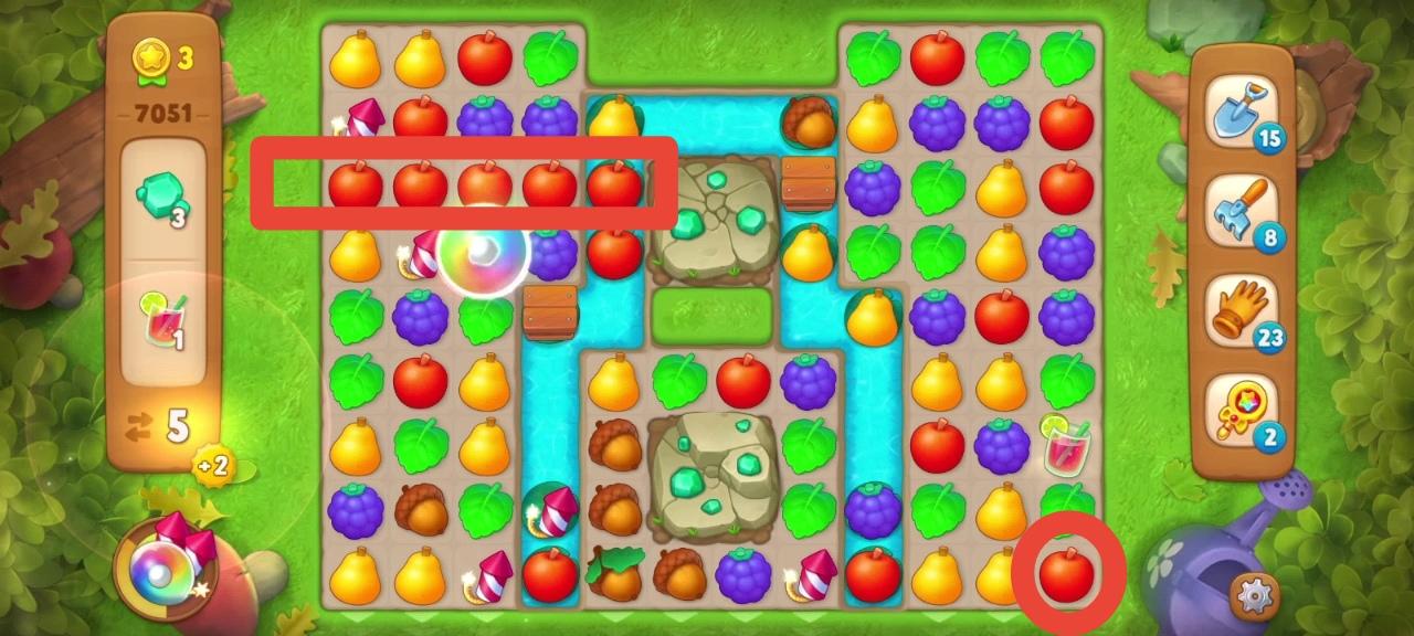 ④过程中有彩虹球要注意灵活运用,我选择和苹果匹配,因为可以制作炸!弹清除右边的岩石,并且最后一个柠檬水下落的方向也有一个苹果!