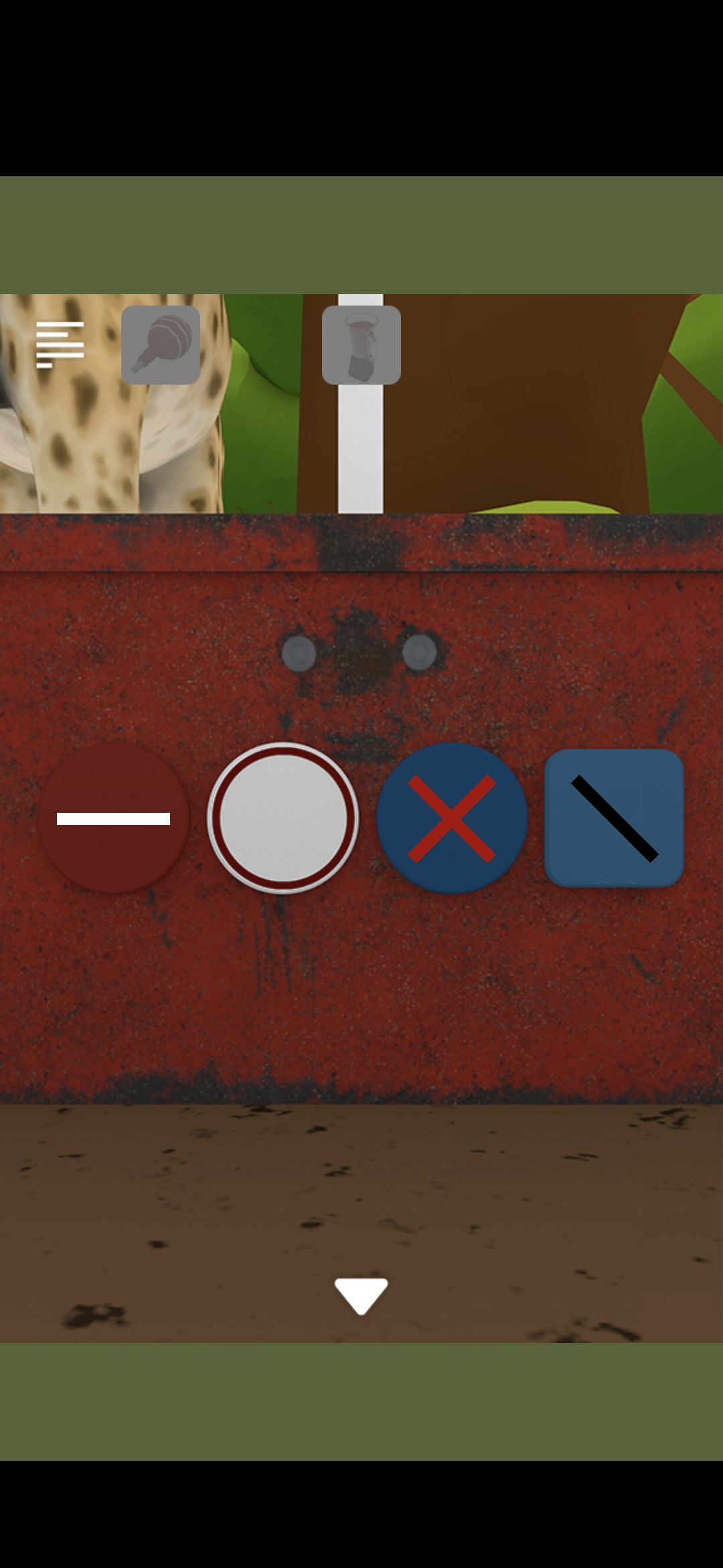 点两下左侧垃圾堆,把杠铃放在垃圾箱的踏板上得小刀,开垃圾箱旁边的纸箱,得门把手,按巧克力的颜色开右侧ATM机下方格子,得榨汁机,点开榨汁机,打开盖子放入草莓,等待一会,得草莓汁
