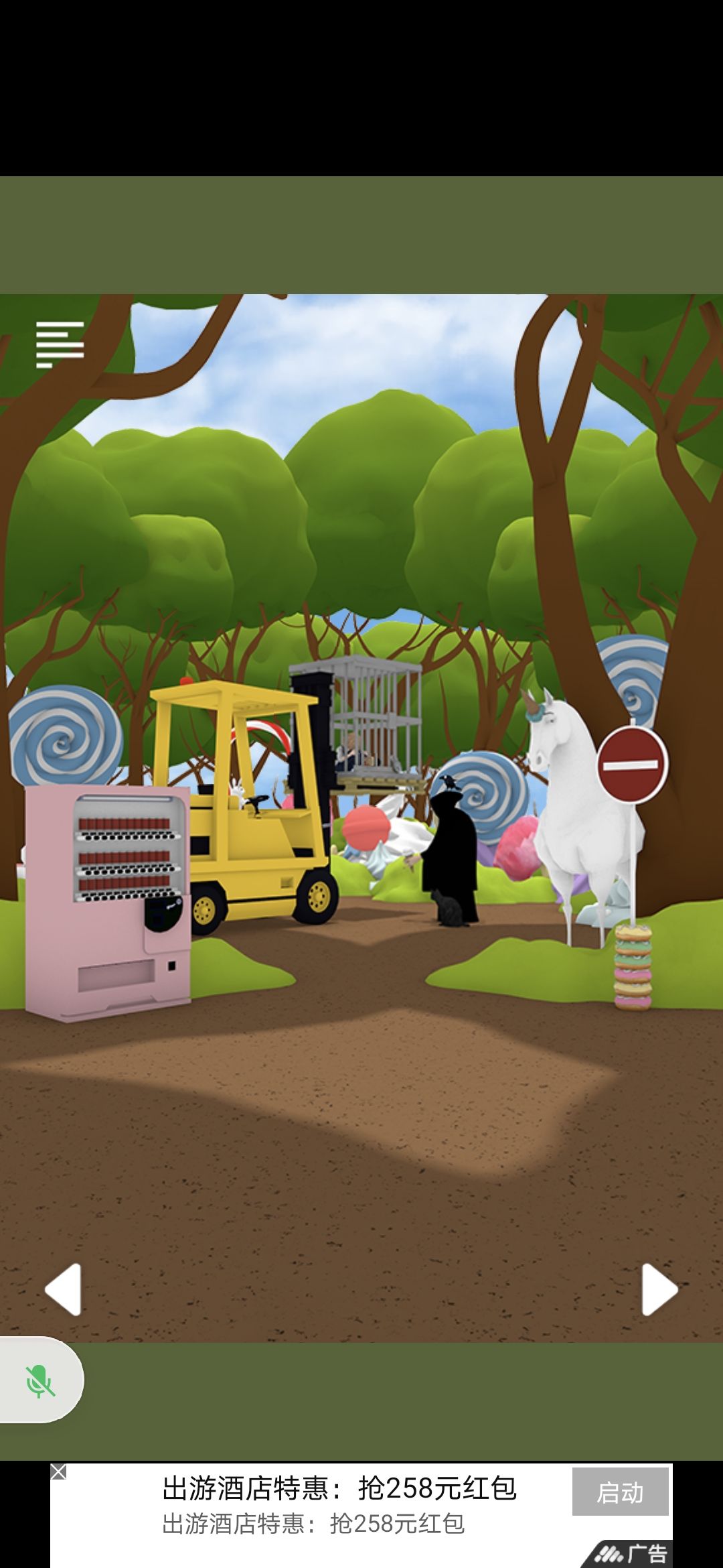 回白马图,把拉杆装到叉车旁边断了的拉杆上,用钥匙开笼子,得面包,把面包给糖果屋图的小女孩
