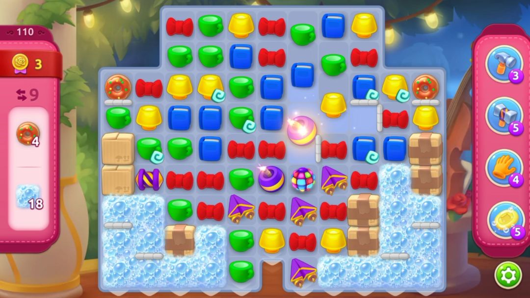 经过几步的合成,中间的墙壁已经被摧毁了,这个时候重点要解决下面几个两层的箱子,在其旁边合成元素或用道具都可,当然道具是最香的,还能解决下面的泡沫。