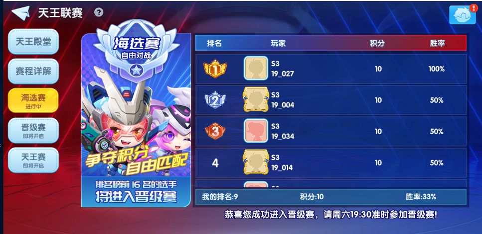 ☆周五海选赛结束,积分排行前16玩家进入晋级赛