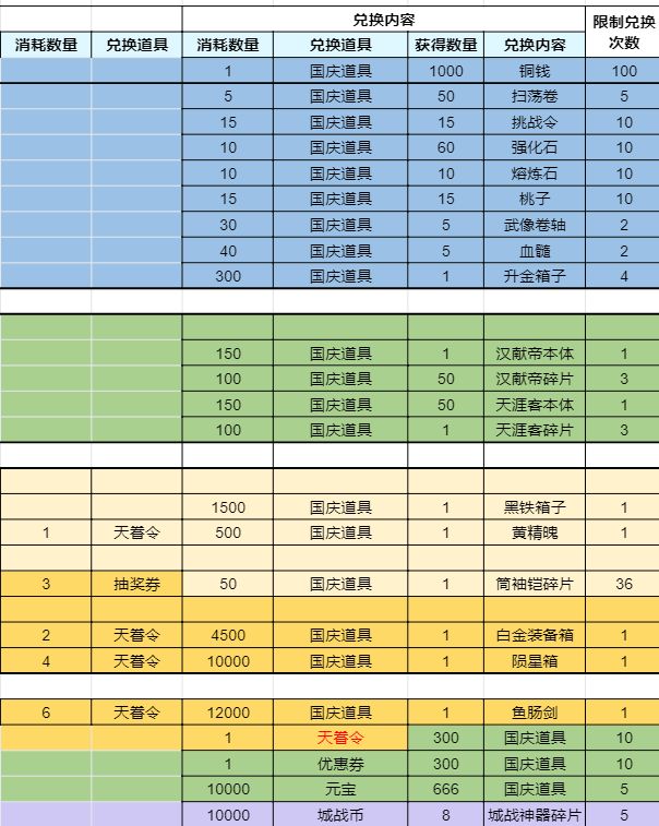 活动内容:活动期间,通过副本获得掉落的国庆道具来兑换心仪的武器装备,兑换数据详细见上图↑