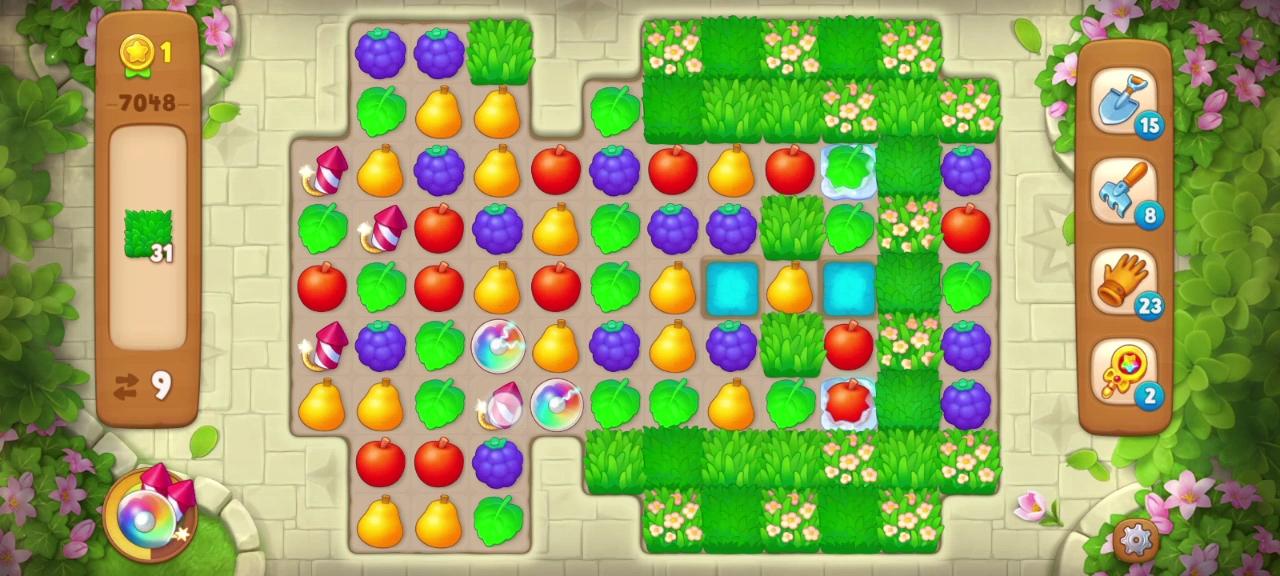 ④剩下6步,还差9个草地,需要两次匹配的草地就我标注的2个,匹配下方的葡萄可以收集3个草地,剩下的合理利用道具和匹配就能通关!