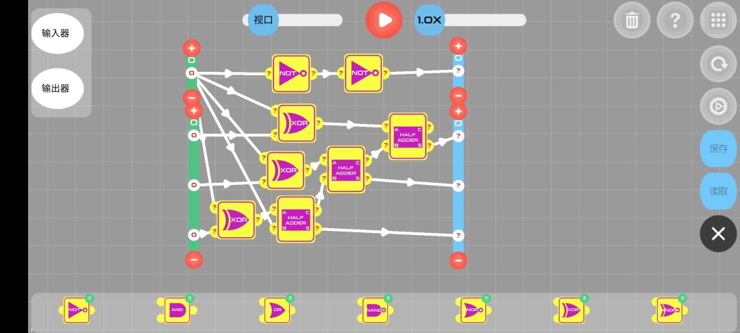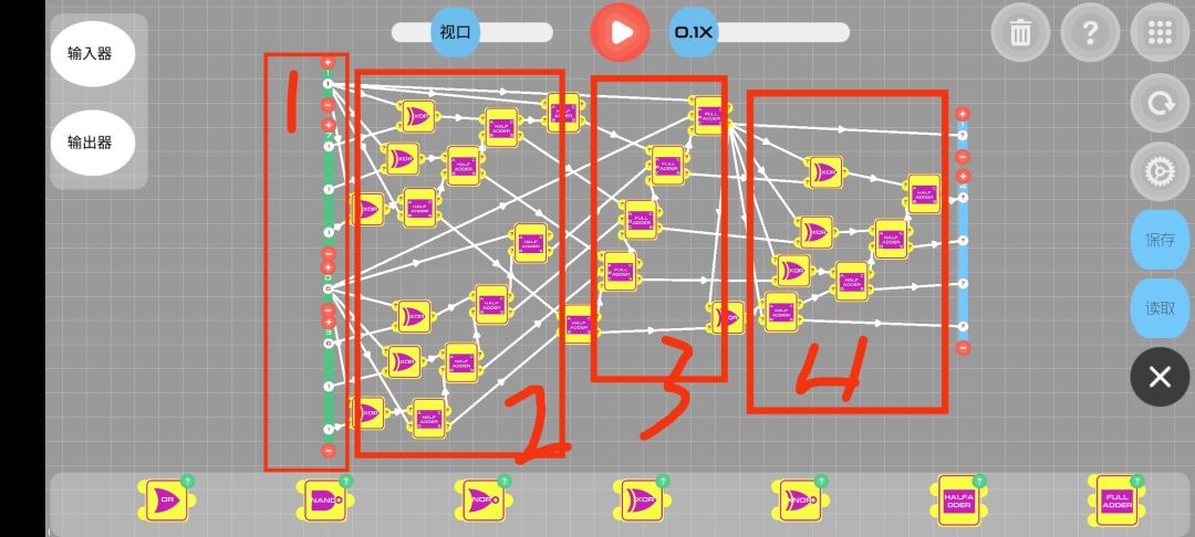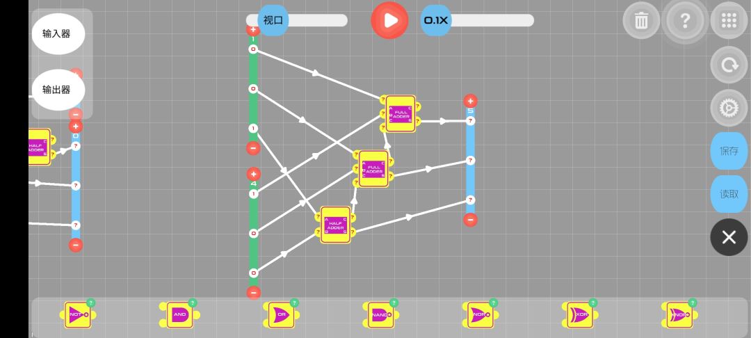 今天捣鼓了一个可以进行负数运算的四位二进制加法器,理论上可以无限堆叠位数(只要处理好边界问题),但是其中为了解决边界问题会进行增加结果输出的位数,导致了储存浪费,没找到好的解决办法,希望大神能帮帮我😂
