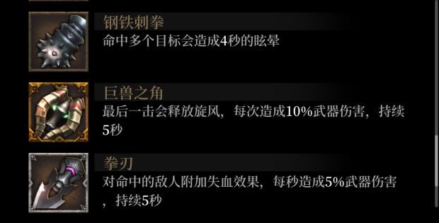 6.拳套是我目前认为最好用的武器,虽然需要一定的熟练度,但是上手不难,而且拳·拳拳的连招也是叠副武器充能,打长时间僵直的神技,最值得一提的是附加流血的那个拳套,可以和VIP送的伯爵时装完美配合,最大的缺点是面对快节奏的boss不好连招,最大的败笔是巨兽之角,虽然是最高级的拳套但是完全没意义,和飓风斗篷是一样的被动。
