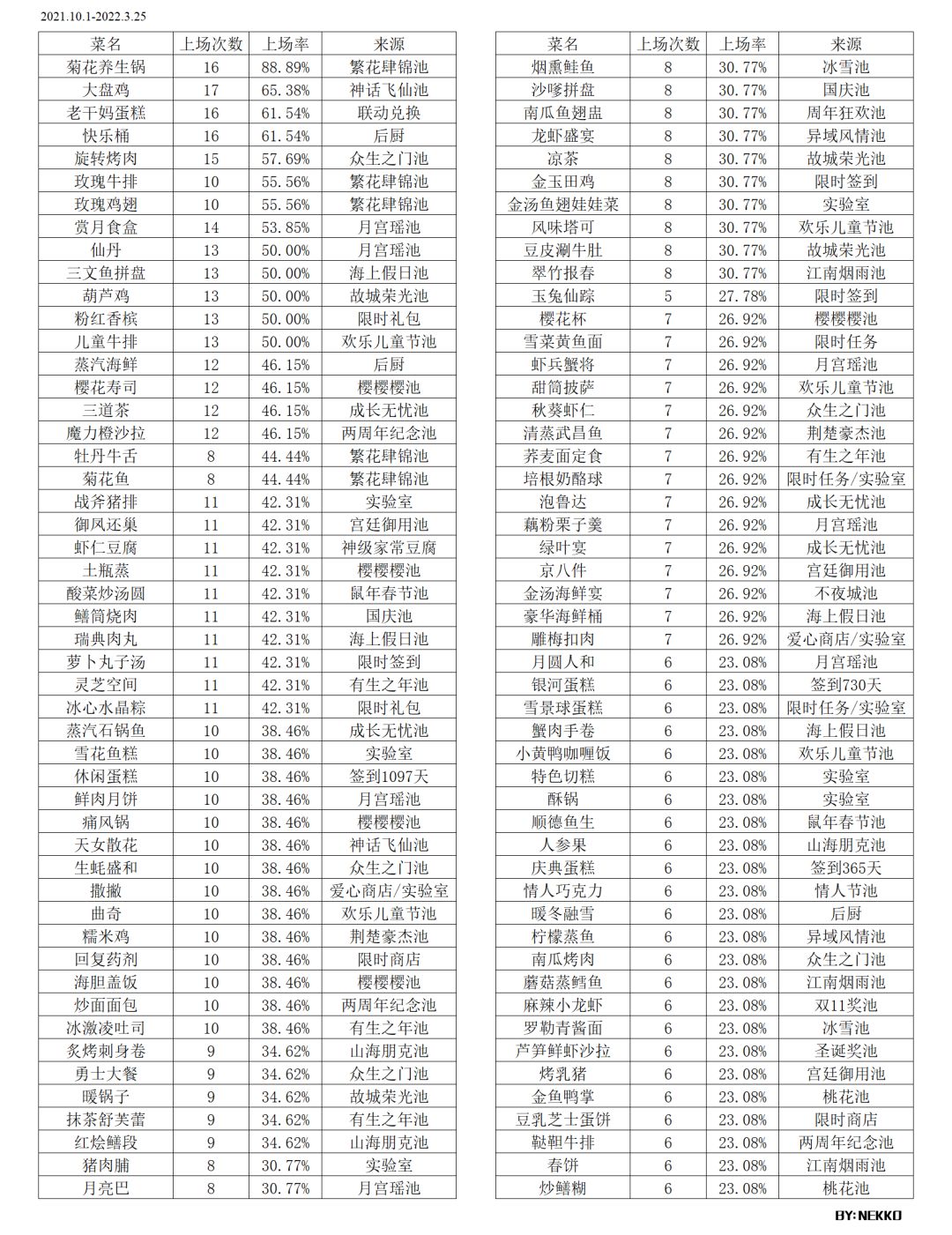 这次统计了从2021.10.1到2022.3.25共计26场御前厨神大赛的高分菜谱,由于仅选取了每场排前50的菜谱,因此可能会有遗漏