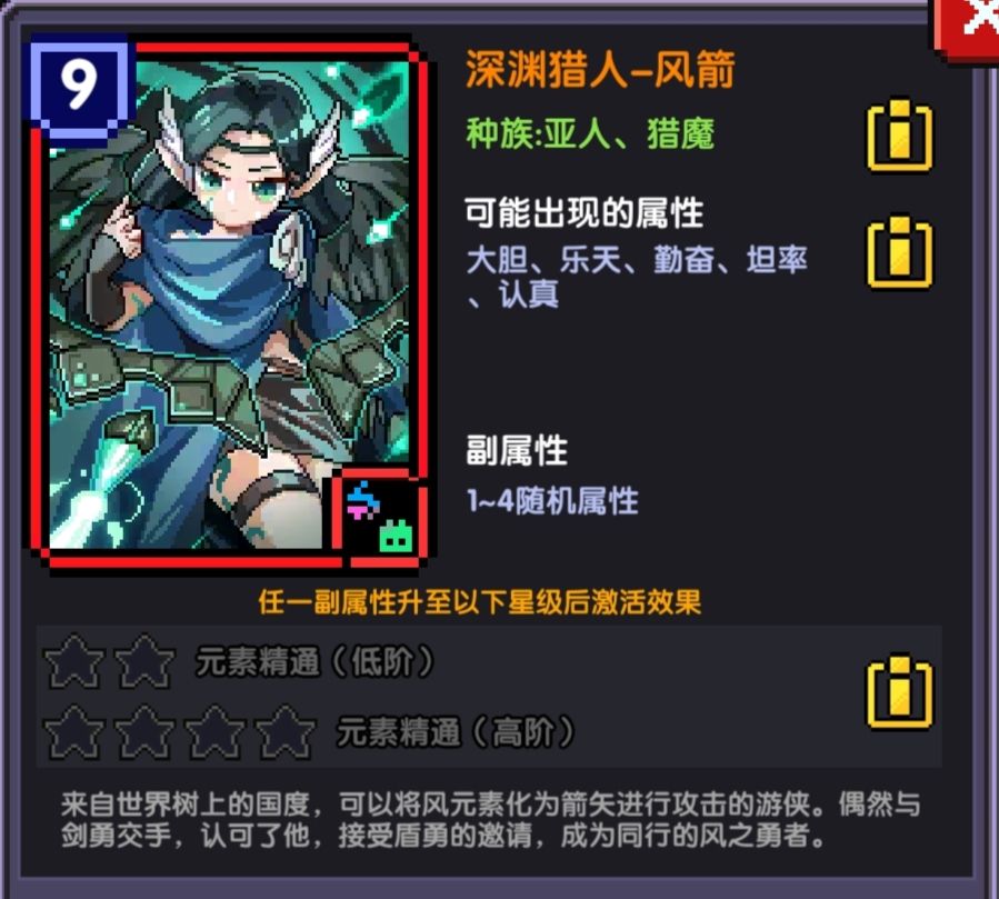 ⭐:装备魂卡「深渊猎人-风箭」时,副属性不再生效,但魂卡等级直接提升5级,最高15级,直接获得「元素精通(低阶)」。