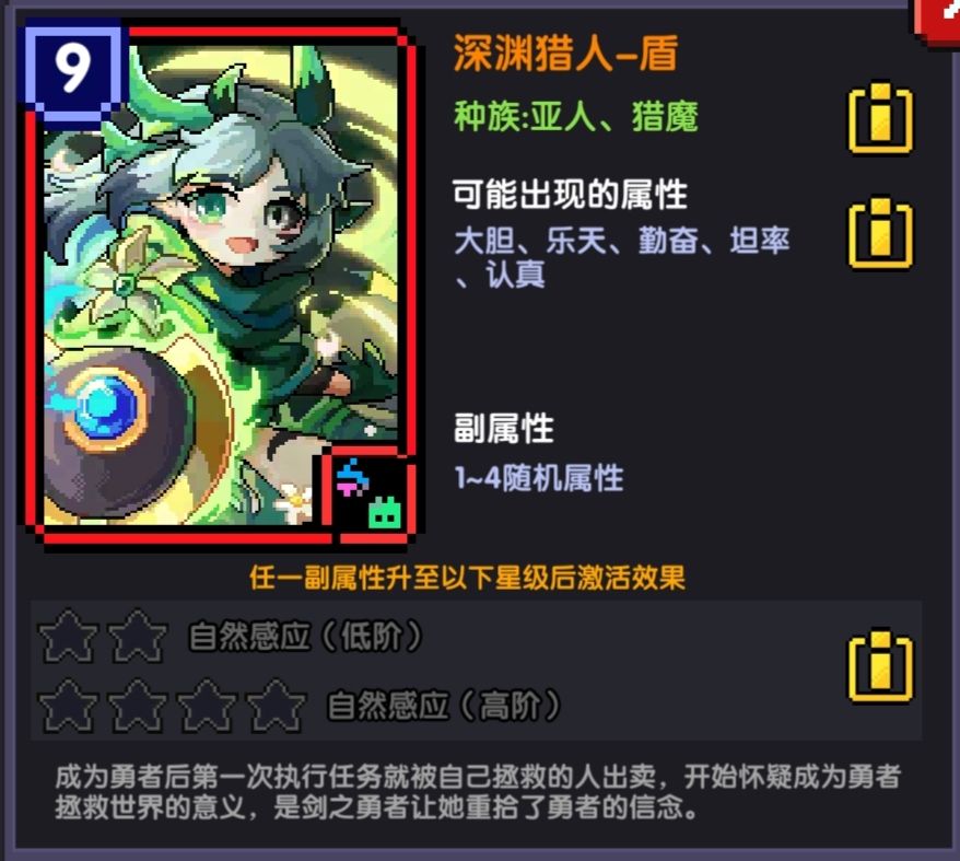 ⭐:装备魂卡「深渊猎人-盾」时,副属性不再失效,但魂卡等级直接提升5级,最高15级,同时获得「自然感应(低阶)」,穿戴该武器无法普通攻击。