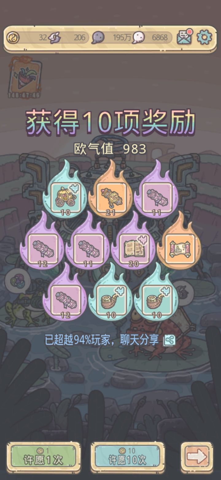 怎么说呢。。欧的时候是真的欧,非的时候也是真非。。600抽一个狗眼也没有的时候有过。100抽电气锤也有过。好多sss都是用因子换的,比如羽毛呀,黑洞,灵魂容器什么的。挺喜欢的!最后祝大家华诞快乐😝