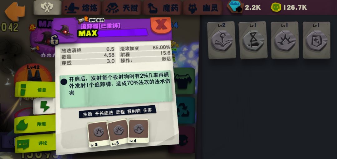 由于天赋取消了近距离击退,所以在游走也变的很不安全,而追踪帽的飞弹距离非常远,基本看不到怪就能打出去,所以爬楼非常安全!(特别碰到是攻击带眩晕的怪物)