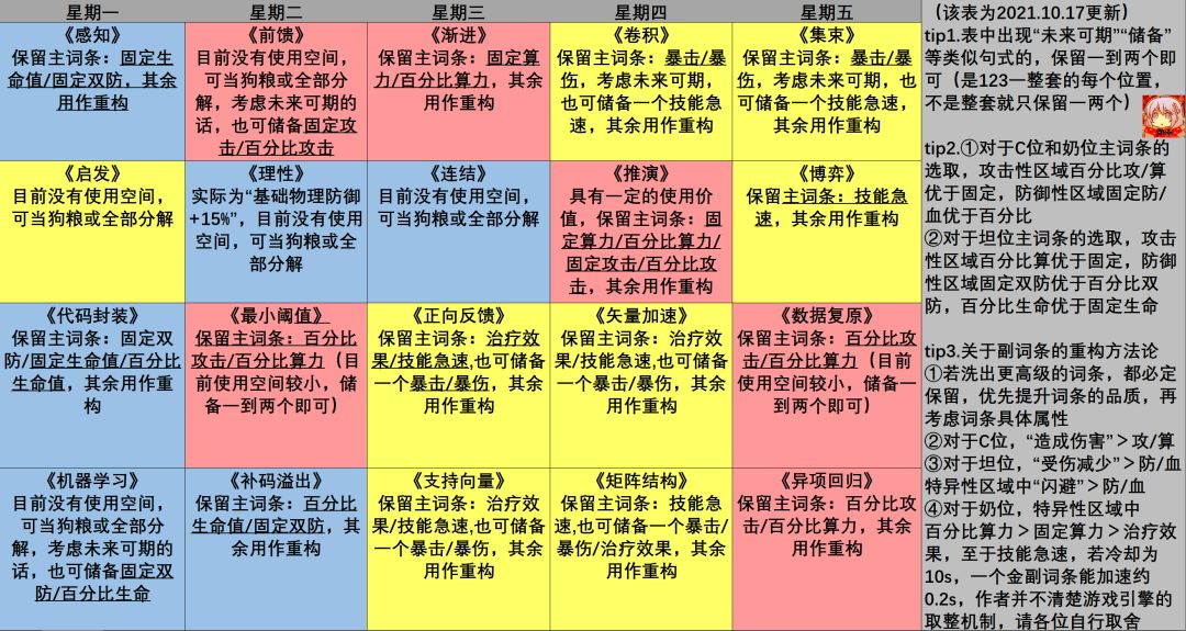 2、同样是参考多位人形的算法搭配后,我将该表重新定位,该表仅为算法推荐刷取表,并非具体人形的算法搭配表(但我标注不推荐的那确实是没用的算法),各位可以根据需要合理分配体力刷取,至于周末,由于是混池,所以推荐各位不去刷取算法,而是用来提升技能等级(如果时间多,也可以去高层无尽刷技能枢核)