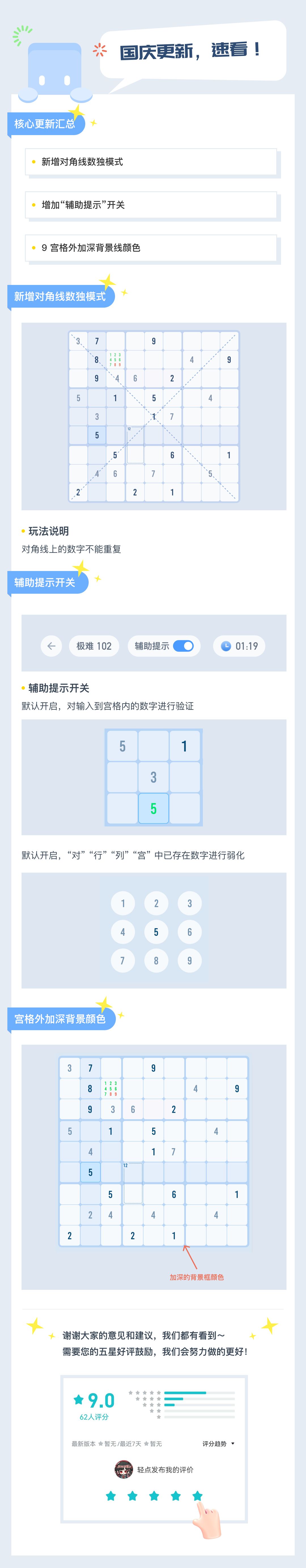 国庆更新,新增对角线数独玩法,辅助提示开关,9宫格加深背景颜色
