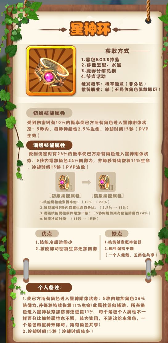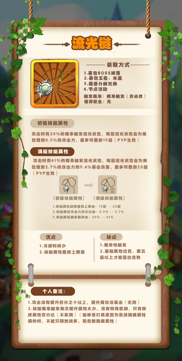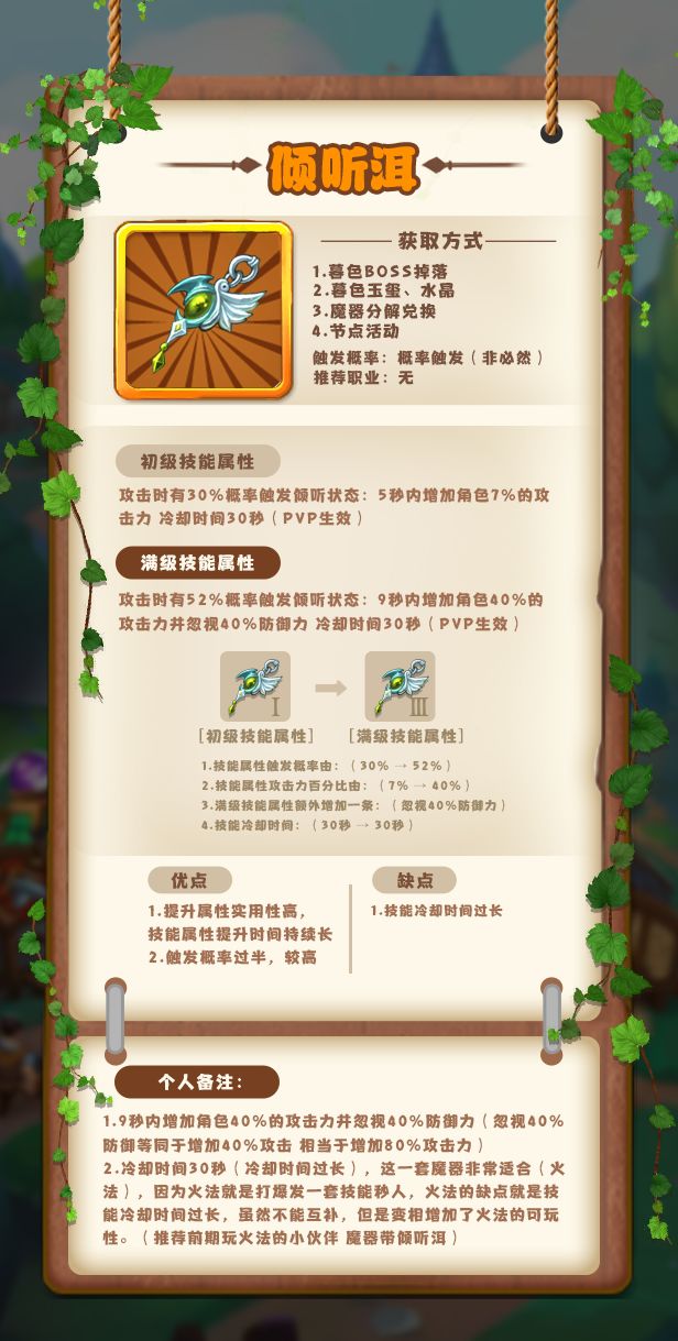 前期选择魔器基本上就是1倾听洱4承天环,这样属于平民玩家,只需要到后期换掉倾听洱换成血灵链即可,这样可以很大的节省材料,倾听洱只是前期过渡用的,为什么我只说了三种主角,因为现在游戏内主流就是这三种职业了,前中后都包括,火法放前期,敏攻和毒弓自选,敏攻偏向PVP,毒弓偏向于PVE。敏攻本来就是攻速快加吸血效果,血灵链等同于变相加强了敏攻。
