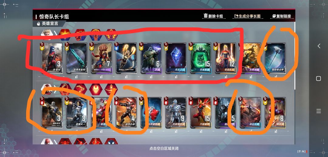 讲解下思路,拿牌的时候别盲目一个配置,看选角色给的橙卡是什么,基本盘会在惊队钢铁侠蜘蛛侠这三个角色中拿(有更好的思路大家也可以自己做下其他角色的帖子,我jjc主攻这三个角色的。。。) 开局惊队给的是惊队,可以考虑走惊队为核心的宇宙战争(胜场稳定,容易7胜,由于jjc同行变多,吃鸡难度变大)。如果给光谱或塔洛斯,可以走光谱月亮石为核心的宇宙战争(吃鸡稳定,5胜+保底,7胜较看脸,容易前期被血入,成型过后无解吊打一切)。如果你开局拿到的是钢铁侠的万能装甲或究极钢铁侠,同时拿到星河呼唤,可以走万能复制流(快乐玩法,胜场不稳,主要看速5后刷万能装甲的频率。除了害怕成型的光谱月亮石,不过你面板如果能刷到一定程度,光谱月亮石也不一定能解决你。)