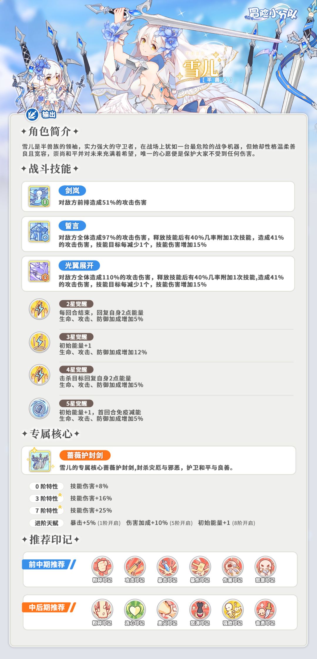 简介:雪儿是半兽族的领袖,实力强大的守卫者,在战场上犹如一台最危险的战争机器,但她却性格温柔善良且宽容,崇尚和平并对未来充满着希望,唯一的心愿便是保护大家不受到任何伤害。