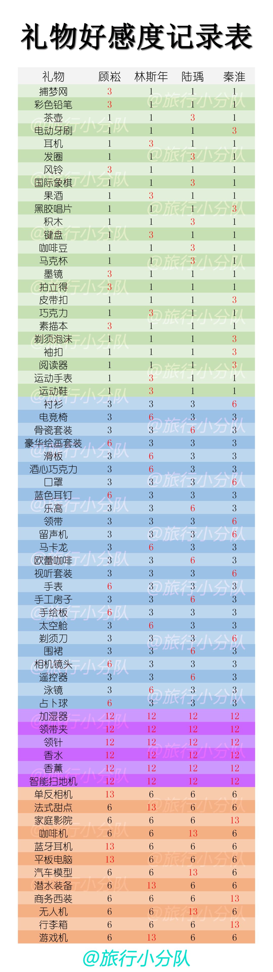 该表格按颜色区分礼物等级,红色突出数值为该礼物最佳赠送人选;