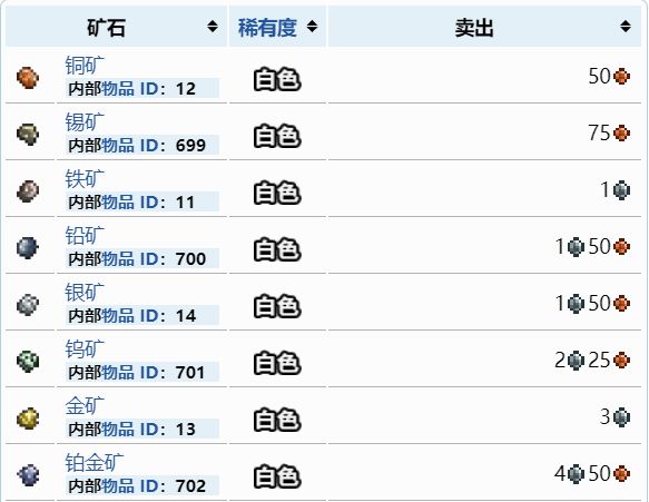 初始矿共八种,但一个正常世界只会固定生成四种。当然,也可以获得其他矿石,比如通过钓鱼和提炼泥沙块等,但自然生成的只有四种。