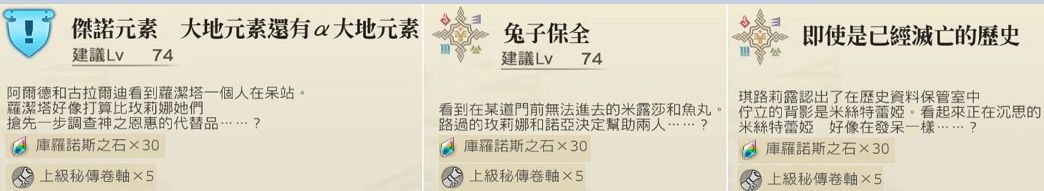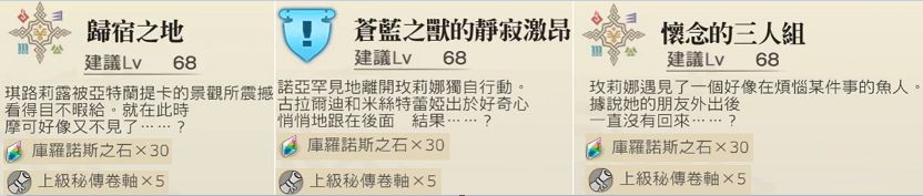 支线:亚特兰提卡《归宿之地》(前置任务《那小家伙不为人知的一面》,再前置任务《邀请可爱的你》),《苍蓝之兽的寂静激昂》,《怀念的三人组》