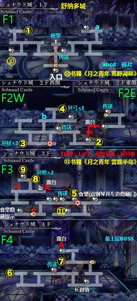 宝箱:①~⑪,其中③是冥杖×2,④是冥弓×1,⑤是冥锤×3+梦书×1+穷鼠啮猫徽章(HP<50%时伤害+15%),要点食堂的钢琴开启左边隐藏门,⑧是冥枪×2,⑩是书籍《月之青年 荒野湖畔》(屋里右边小闪光),⑪是书籍《月之青年 雷霆半岛》(屋里右边小闪光)