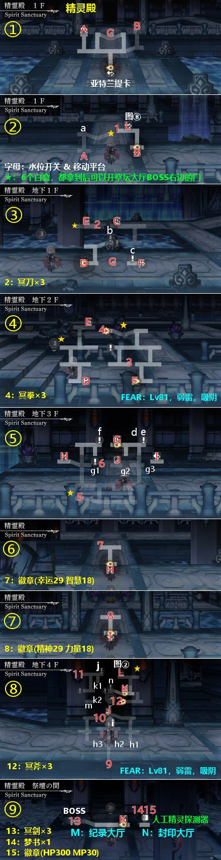 入口→A→a→白盒(图②)(点它就行,这个开了后面5个才能开)→A→C→b→D→白盒(图④左)→E→白盒(图③)&宝箱2→E→F→c→F→白盒(图④右)&宝箱4→F→G→d→白盒(图⑤)→H→宝箱7→H→f×2→g1→g2→I→宝箱8→I→g3→d→J→h1→i→h2→i→h3→j→k1→m(瀑布开关)→k2→k1→宝箱12→j→k1→n→白盒(图⑧)→(L开通到图②的门)→K→BOSS→宝箱13(纪录大厅右边)→通关后重新回到图⑨,如果6个白盒都收集齐了,可以进入N,拿宝箱14和15,以及人工精灵探测器