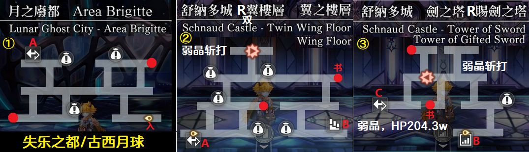 宝箱:1~16,其中1是解除钥匙Lv1,2是冥弓×1,5是冥锤×3,6是解除钥匙Lv2,8是冥剑×1(完成支线《兔子保全》后拿),10是徽章(智慧29 速度18)(完成支线《兔子保全》后拿),12是冥杖×4,15是冥枪×2,16是书籍《月之青年 炎热河口湾》(实验室右边闪光)