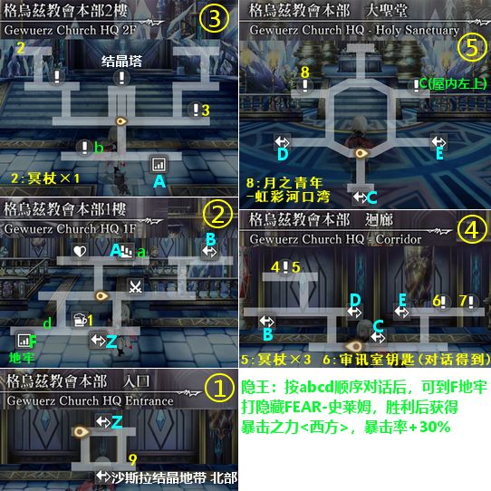 宝箱:1~7,其中4是冥杖×1,5~7在第4话通关后才能拿(5和旅馆外翼人对话飞过去)