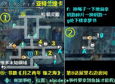 餐馆事件:调查亚特兰提卡5个闪光处abcde,即可在酒馆观看5个特殊剧情,每个剧情给5石,其中e的剧情必须有鱼妹才能看