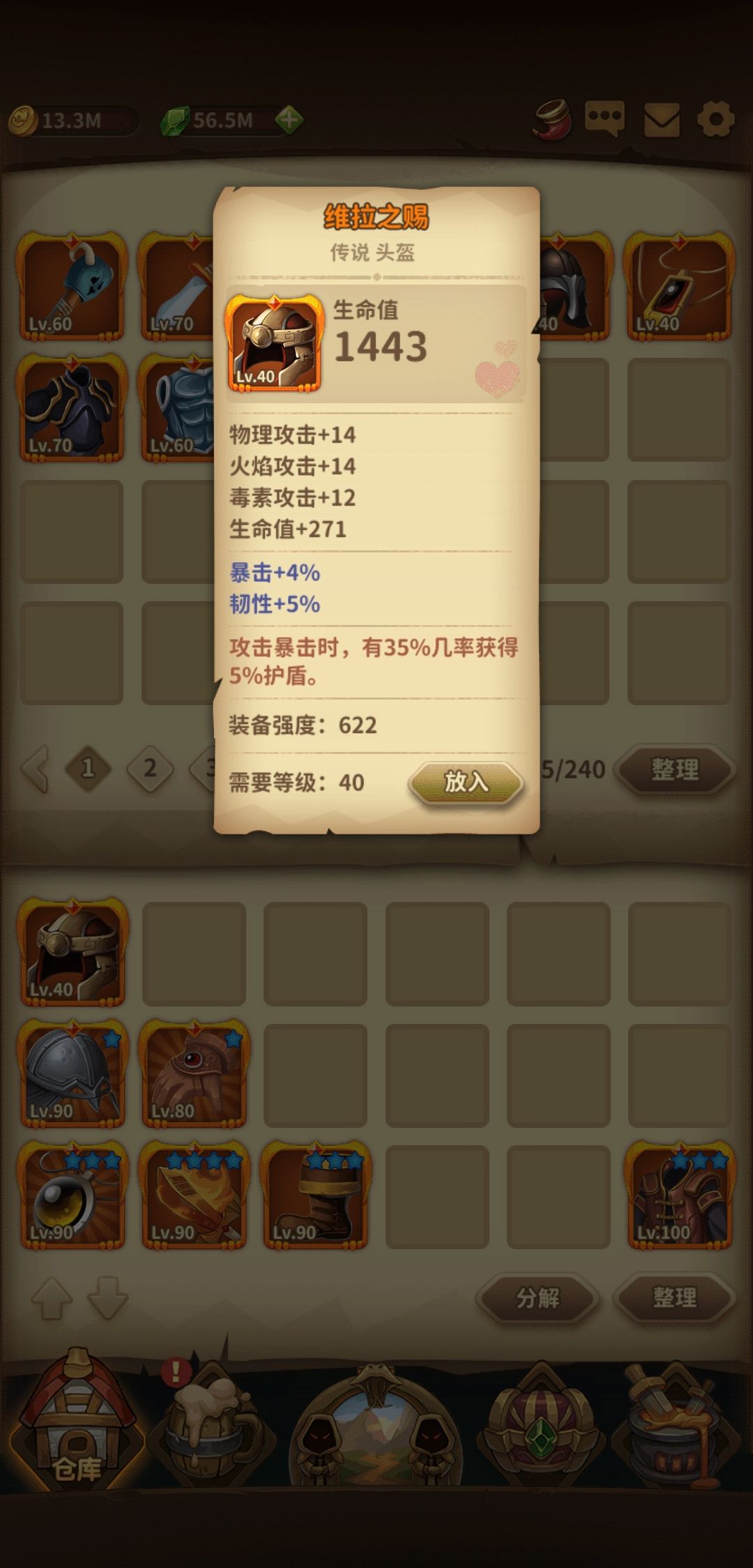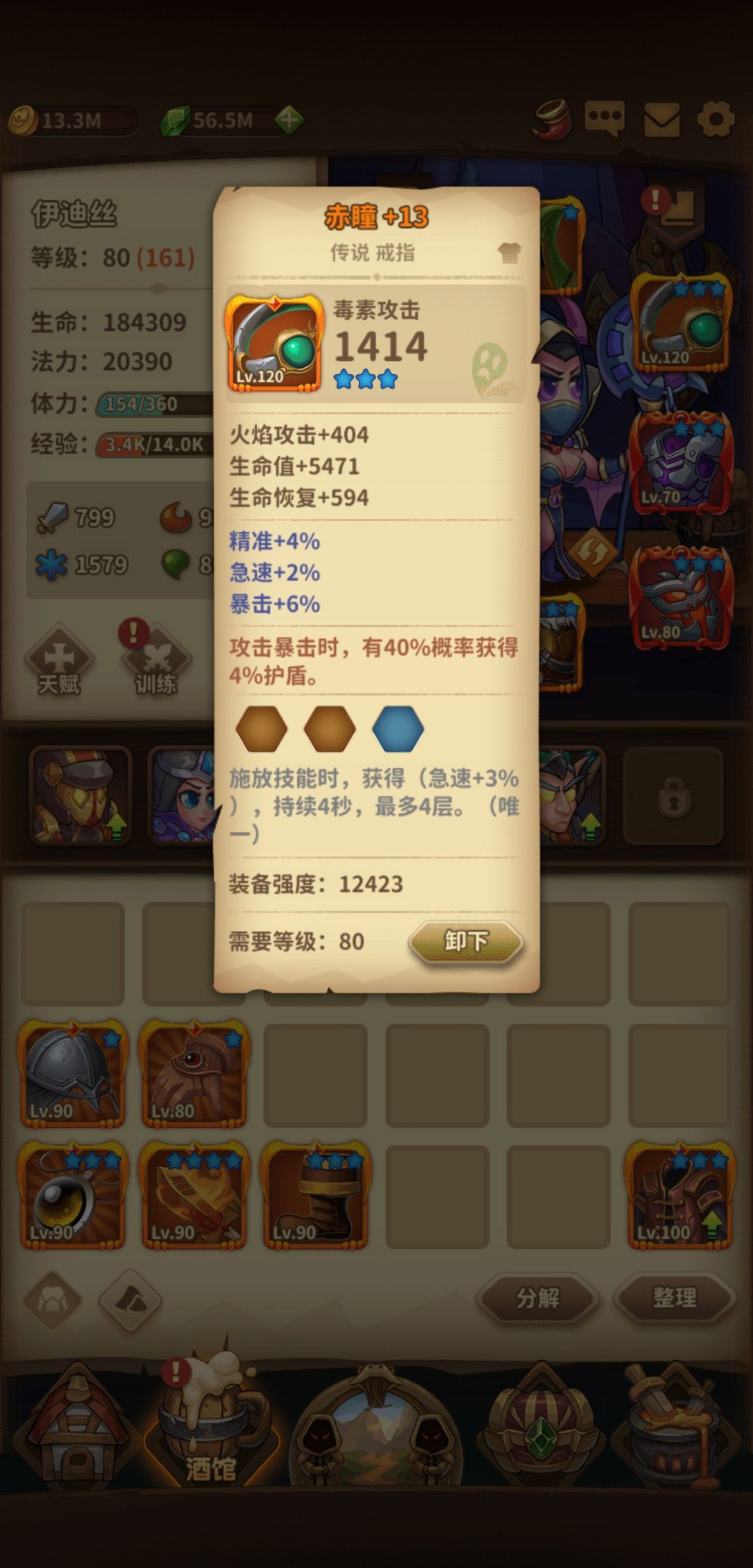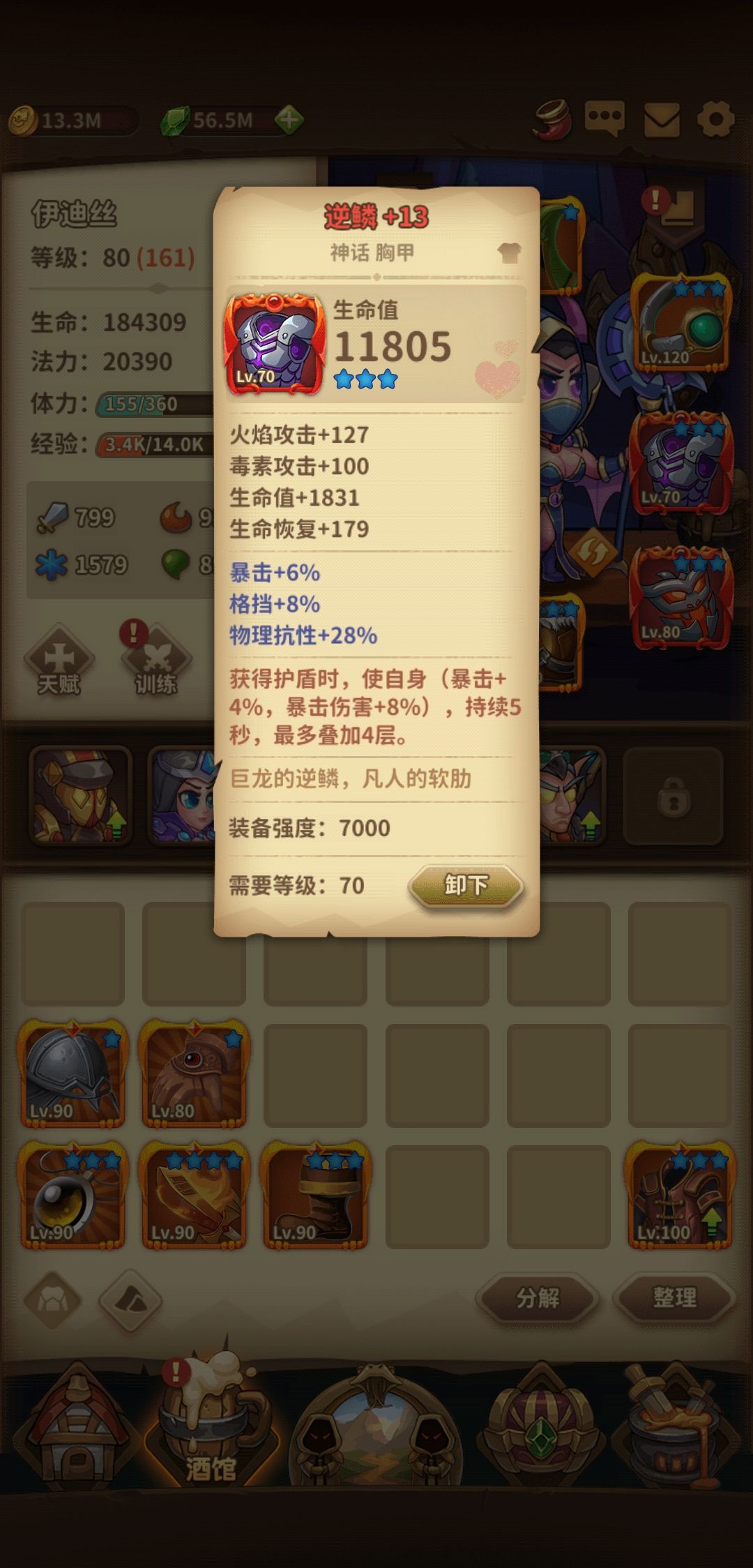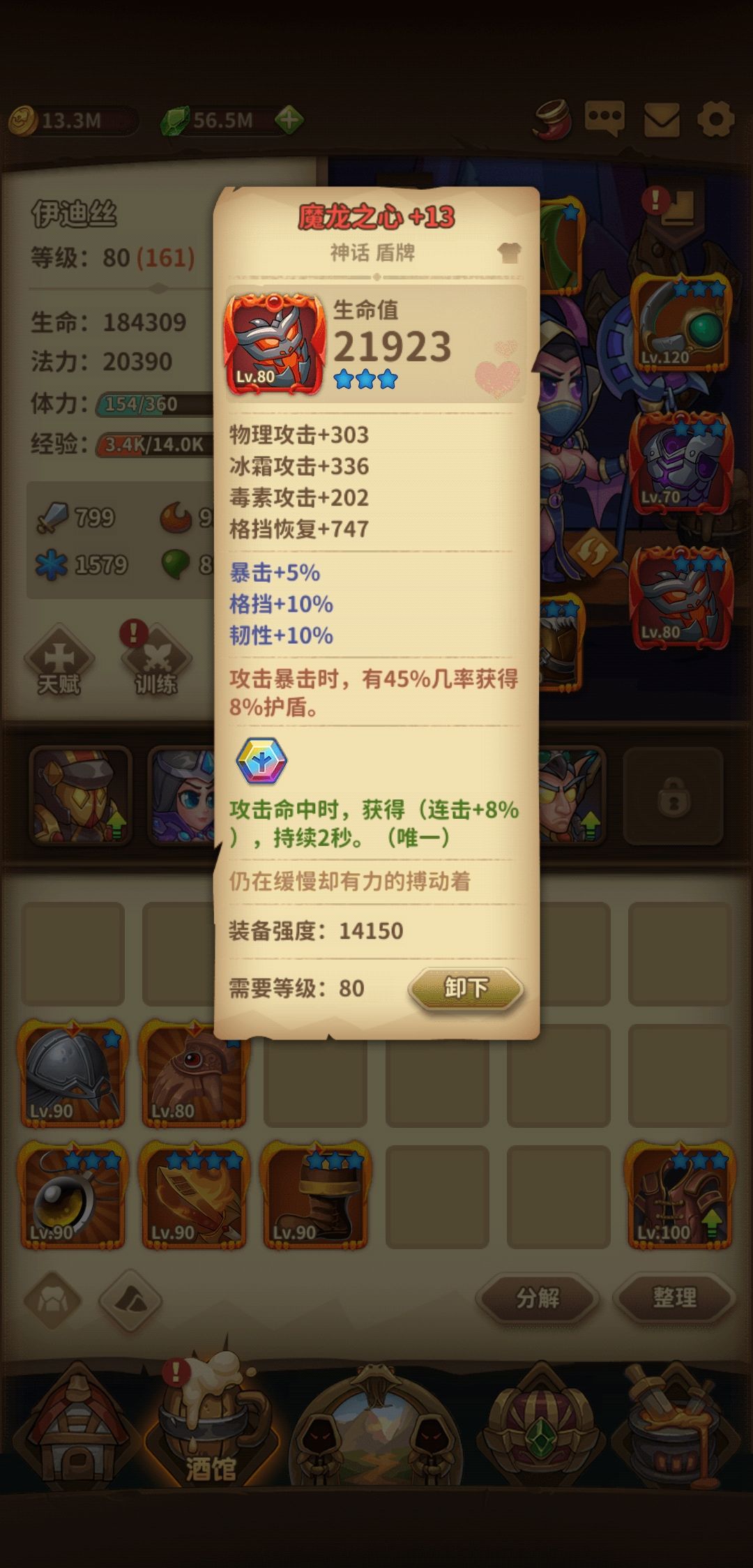 手套:德古拉之握,这个手套特效非常好可以不能萃取,加蓝加血保证续航。鞋子振奋加速度,打得越快刷盾越快。项链信念,专精一个力量继续刷盾。武器憎恨好过开天,因为中期只能带双神话,武器只能用传说。