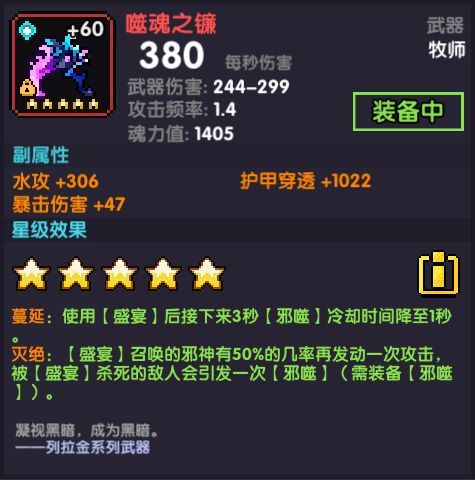 在武器方面我们选择的是:噬魂之镰、月面支援、爆能星
