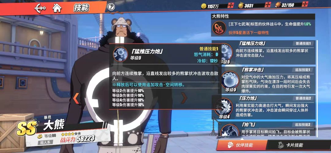 在实战中,虽然大熊被增强过,少了一些僵直,和普攻的增强,但是还是会显得有点笨重,那我们就可以用跺脚来保护自己,跺脚激斗技用的时候还会击飞敌人一段距离,实战中建议对方先把比你速度快的远程技能用完后,你再使用技能,比如艾尼路的飞鸟,艾斯的火枪之类...一技能打中以后可以马上使用追加攻击,这里建议马上使用二技能或者熊掌冲击使对面处于倒地被打状态,因为大熊一技能和普攻都是平推,对方使用友情技极容易被反打,打的过程中可以留一格熊掌冲击来压起身,然后释放一技能或者二技能,这样对方会比较难闪避,也比较容易起手,遇上像索隆这样多霸体的伙伴,我们可以留两格熊掌能量,或者使用跺脚加两格能量,对方起身后,先空a一下,骗一下对方,让他误以为要平a他,然后使用拍飞,使用跺脚的时候不要马上使用拍飞,很容易会空,跺脚以后用个闪逃离先,再使用二技能比较好。