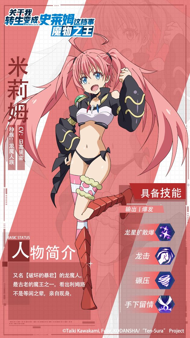 在第二季动画中,米莉姆的表现更是亮眼,不仅荣获鸠拉联邦奥斯卡奖的名头,还挑起了经费战士的担子,为粉丝们送上了精彩的战斗画面。在《关于我转生变成史莱姆这档事》手游中,战斗力属于天花板级别的米莉姆,能够操控星粒子对敌人进行攻击,使用龙星扩散爆作为必杀技,让敌人亲身感受天差地别的实力差距。
