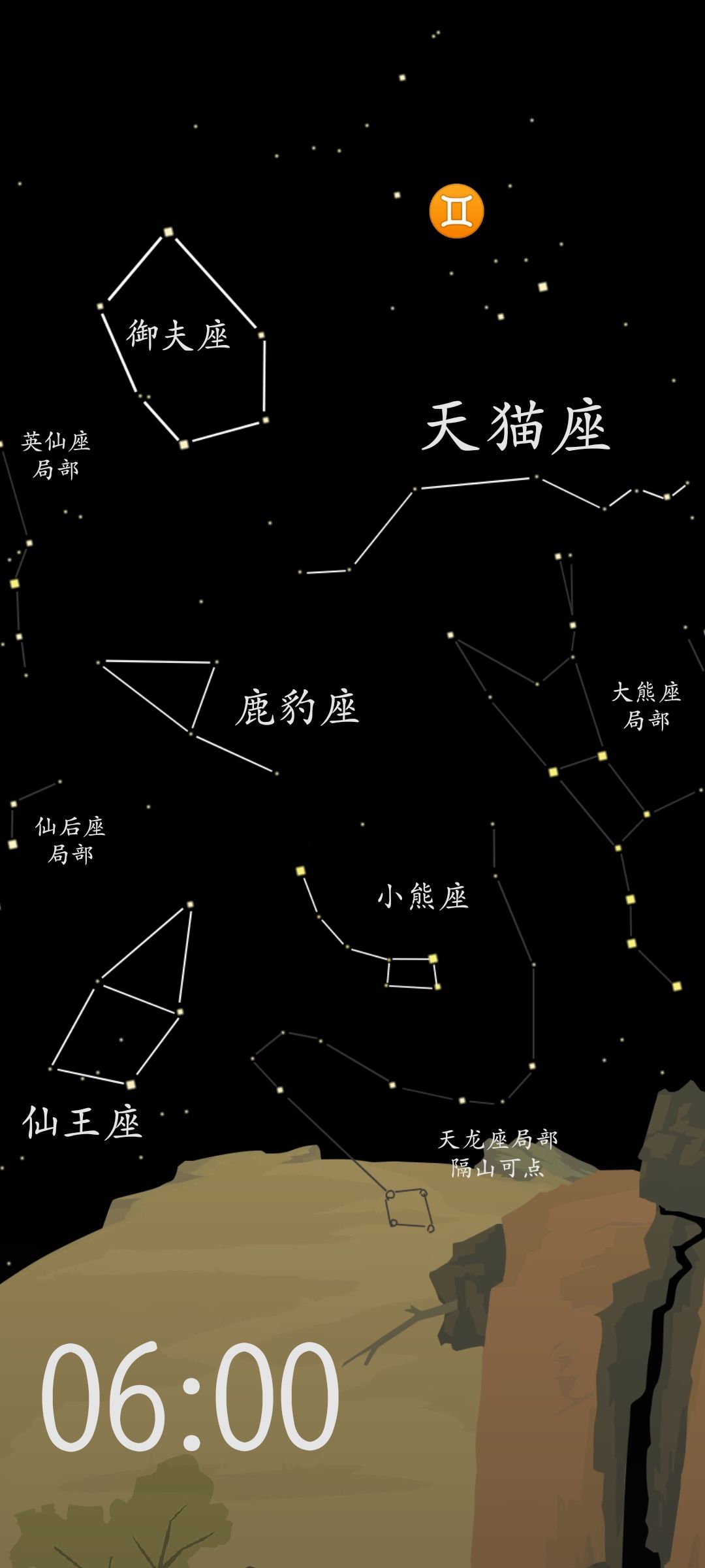 晨6:00能收集到的完整星座有:小熊座、鹿豹座、御夫座、天猫座和仙王座共计5个星座。