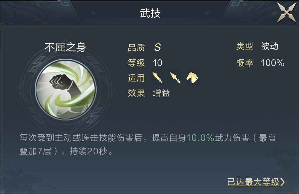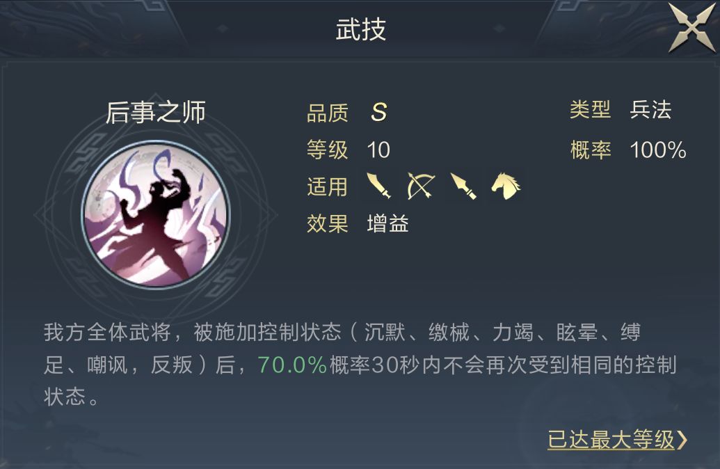 如枕戈待旦、不屈之身都非常适合他,前者增益稳定但叠加缓慢,后者增益浮动大但叠加速度快,主公们可以根据自身情况选择。另一个技能推荐博文范策,至于为什么使用该技能,下方会进行说明。