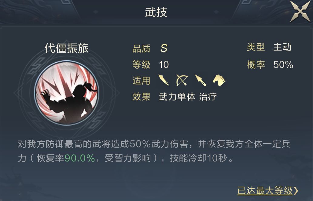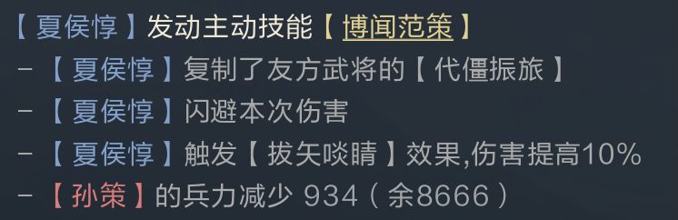 另一技能推荐代僵振旅,该技能的触发较特别,会对己方防御最高的将领造成伤害,之后为己方全体恢复兵力;而拔矢啖睛与不屈之身均可以被此次攻击触发,所以该技能的作用非常广泛,既保证队伍续航,还可提高夏侯惇的输出效率。即使遇到输出技能较少的核弹队或捷足队也拥有一定的主动输出手段,而夏侯惇博文范策的搭配原因就是为了复制代僵振旅。