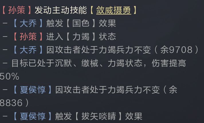战报中可以看到,虽然多为优势平,但敌方核心武将的兵力都非常危险,队伍基本丧失战斗能力。夏侯惇对于常规的主动队、连击队都有着显著的压制力,但队伍整体较吃续航,所以比较惧怕带禁疗的队伍,或是以被动输出为主的队伍。